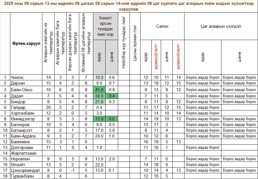 Их бороо: 09 дүгээр сарын 13-ны өдөр Хэнтий аймгийн нутгийн хойд хэсгээр 13.0-41.0 мм их бороо үүнээс хамгийн их нь Баян-Овоод 41.0 мм, Дадалд 30.0, Баян-Адрагад 24.0, Өлзийт 22.0, Биндэрд 21.0, Батширээтэд 17.0 мм их бороо орж цаг агаарын аюултай үзэгдлийн хэмжээнд хүрсэн байна.